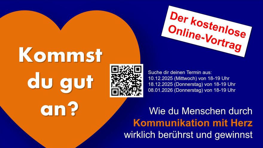 Wenn du deine Fähigkeiten zu Kommunikation und Empathie kostenlos trainieren möchtest, lade ich dich herzlich ein! Dieses Jahr gibt es noch 5 kostenlose Online-Vorträge mit dem Thema: